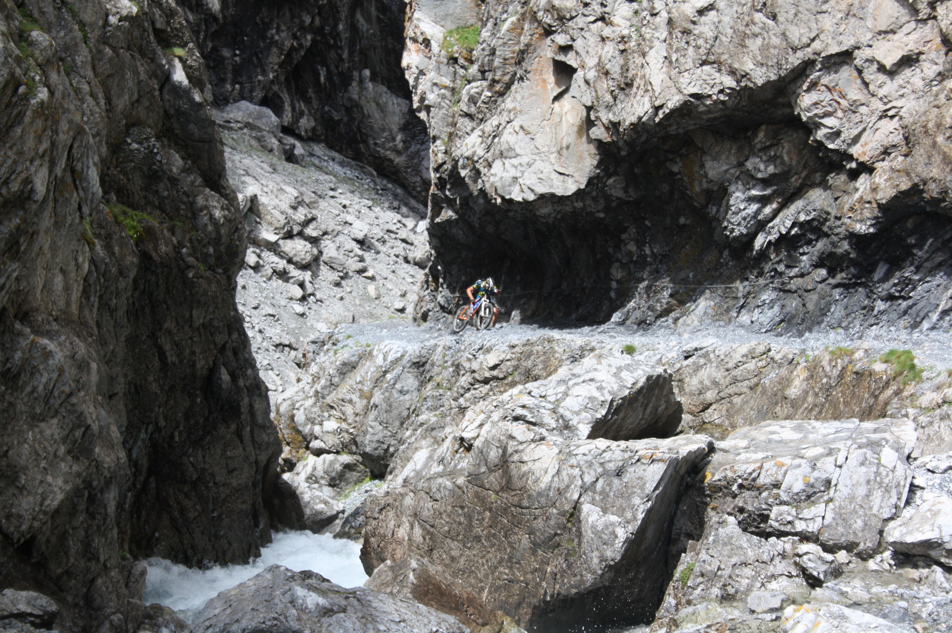 Mountainbiker kommt aus der Uina Schlucht Richtung Alp Sursass.